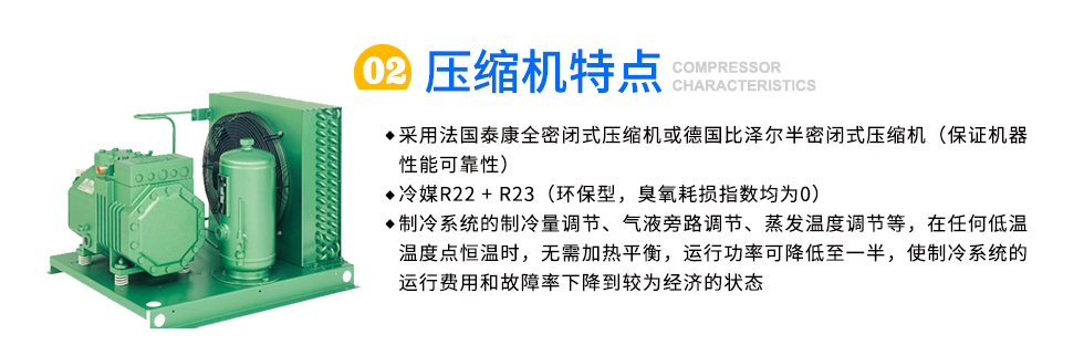 壓縮機: 1,采用法國泰康全密閉式壓縮機或德國比澤爾半密閉式壓縮機(保證機器性能可靠性) 2,冷媒R22 + R23(環(huán)保型,臭氧耗損指數均為0) 3,制冷系統的制冷量調節(jié)、氣液旁路...